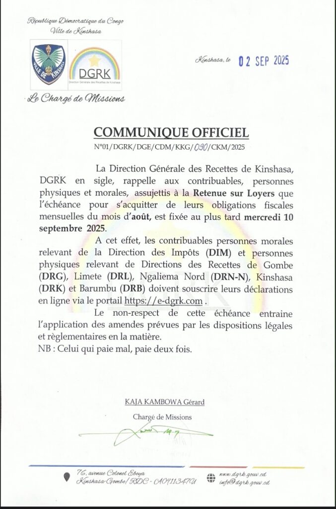 La Direction Générale des Recettes de Kinshasa, DGRK en sigle, rappelle aux contribuables, personnes physiques et morales, assujettis à la Retenue sur Loyers que l’échéance pour s’acquitter de leurs obligations fiscales mensuelles du mois d’août, est fixée au plus tard mercredi 10 septembre 2025. ”