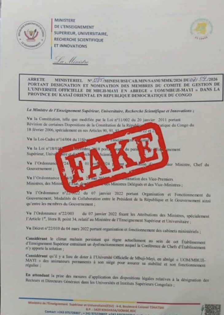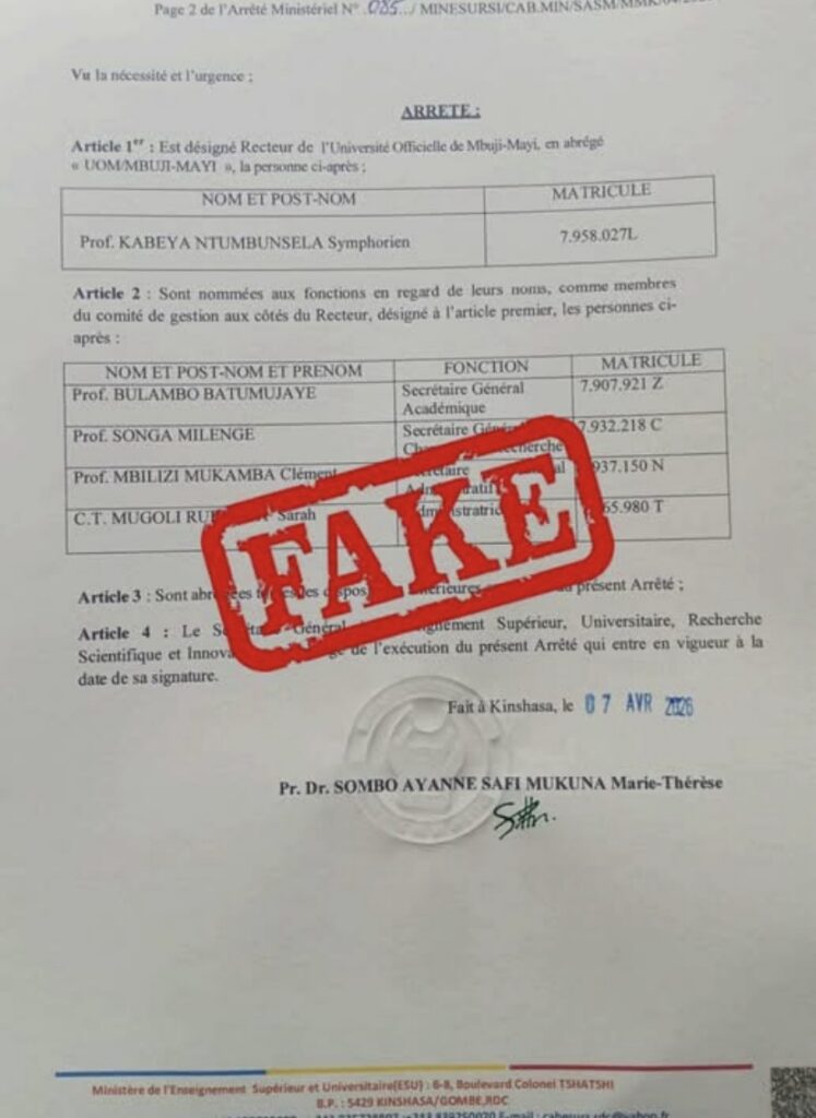 Depuis quelques heures, un document aux apparences officielles sème le trouble au sein de l’opinion publique et de la communauté universitaire. Ce prétendu arrêté, attribué au ministère de l’ESU, annonçait la nomination d’un nouveau comité de gestion à l’Université Officielle de Mbuji-Mayi (UOM), plaçant le professeur Kabeya Ntumbunsela Symphorien au poste de recteur en remplacement de l’actuel dirigeant, l’abbé Apollinaire Tshibaka Tshikongo.