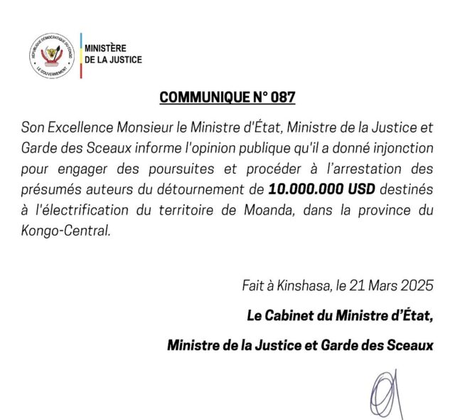 Le Parquet général près la Cour de cassation a annoncé, ce lundi 4 novembre 2024, avoir disculpé Nicolas Kazadi, ancien ministre des Finances, des accusations liées à la surfacturation des forages et lampadaires en République